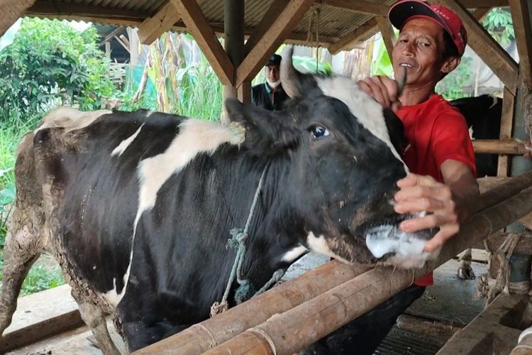 Hendar (53) menunjukan busa di mulut sapi milik nya di Blok Cigeureung Kelurahan Cigugur Kecamaran Cigugur, Kabupaten Kuningan.