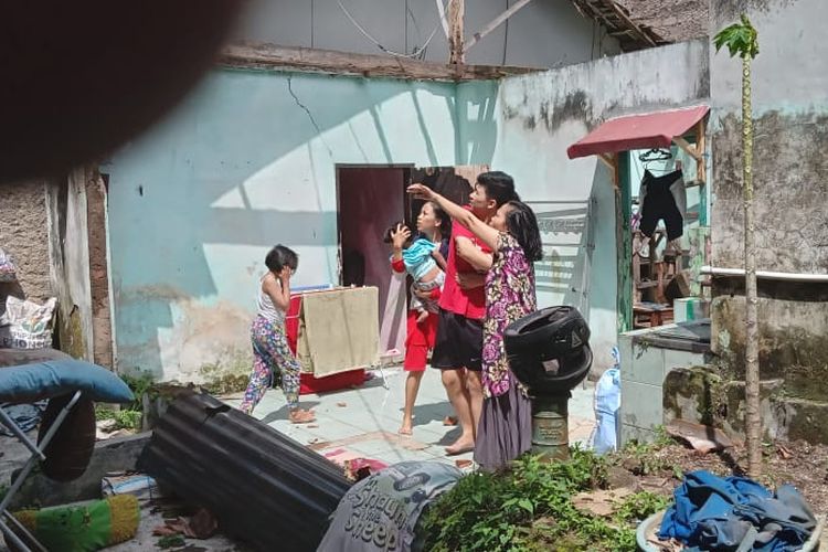 Warga korban gempa Cianjur tengah menunjuk kondisi bangunan imbas gempa dari daerah tersebut, Senin (21/11/2022).
