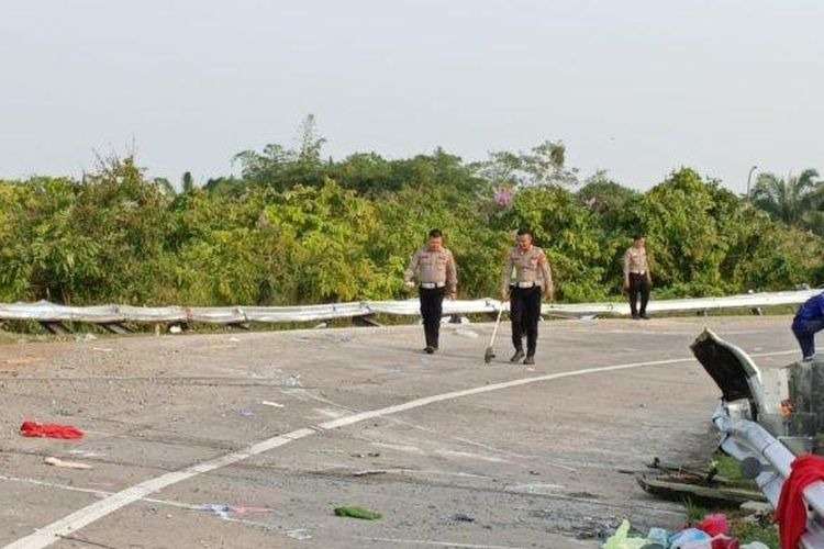 Polisi melakukan olah TKP kecelakaan bus Handoyo di Tol Cipali. Olah TKP digelar Sabtu (16/12/2023).