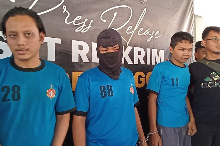 Polisi menangkap tiga tersangka penembakan seorang pria berinisial MAF (22). Ketiga tersangka berinisial SI alias Joday (18), AR (17), dan AZ alias Roy (30). Mereka dihadirkan di Mapolres Bogor, Cibinong, Jawa Barat, saat konferensi pers, Selasa (6/8/2024).(KOMPAS.COM/AFDHALUL IKHSAN)