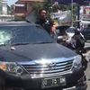 Para pengendara sepeda motor berusaha memberhentikan mobil yang terus melaju secara ugal-ugalan.
