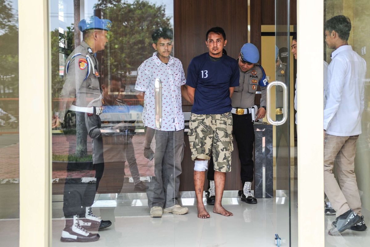 Polisi menggiring tersangka kasus pembacokan mantan Ketua Komisi Yudisial Jaja Ahmad Jayus, Aditya (tengah), saat rilis di Polresta Bandung, Soreang, Kabupaten Bandung, Jawa Barat, Rabu (29/3/2023). Anggota Polresta Bandung berhasil menangkap tersangka Aditya dengan barang bukti sebuah celurit dan kendaraan tersangka, sementara motif pembacokan tersebut adalah pencurian dengan kekerasan.Baca juga: Putri Mantan Ketua KY Jaja Ahmad Jayus Turut Jadi Korban Pembacokan