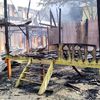 Bangunan tempat penyimpanan hasil pengolahan sampah yang terbakar kini tampak hangus. Rangka atap bangunan yang terbuat dari besi terlihat penyok.
