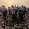 Wisatawan-wisatawan itu berjalan ke laut untuk menyambut korban yang diselamatkan petugas Balawisata.