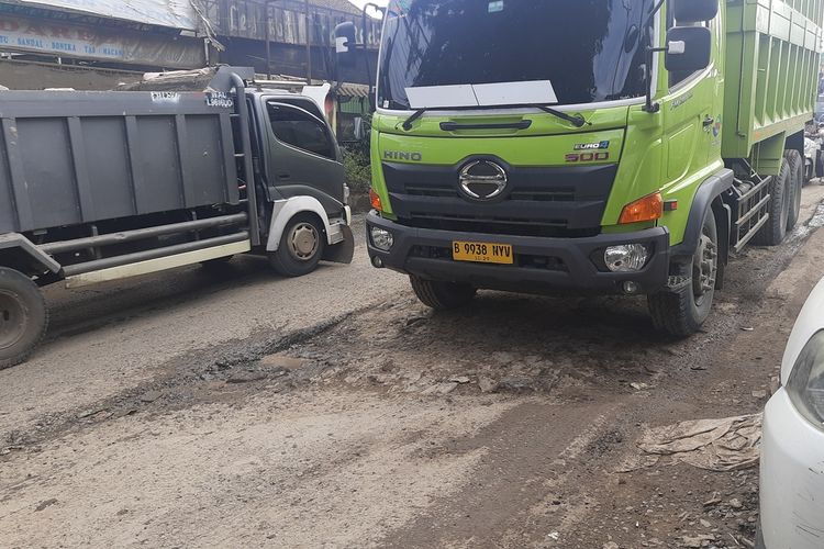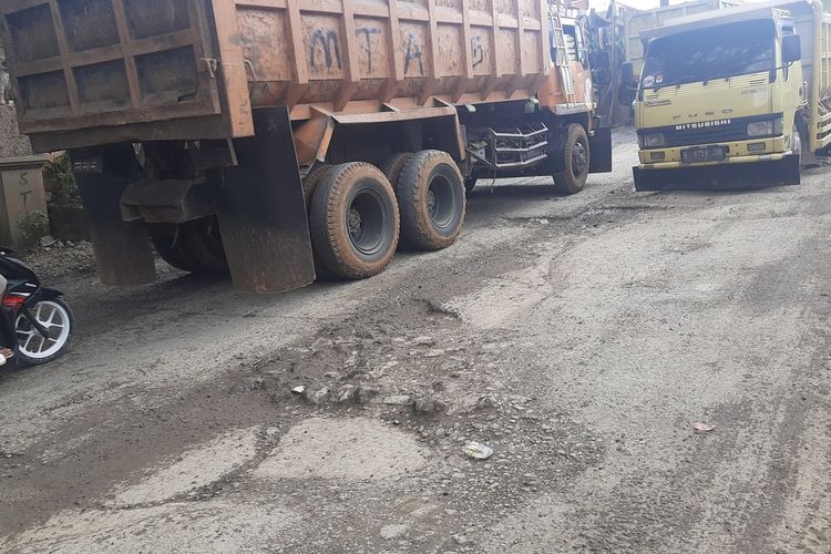 Kondisi jalan yang dilintasi truk tambang di Gunung Sindur hingga Parung Panjang, Kabupaten Bogor, Jawa Barat, Rabu (8/1/2025).Beruntung, warga sekitar segera memberikan pertolongan. Sementara keponakannya menangis ketakutan.
