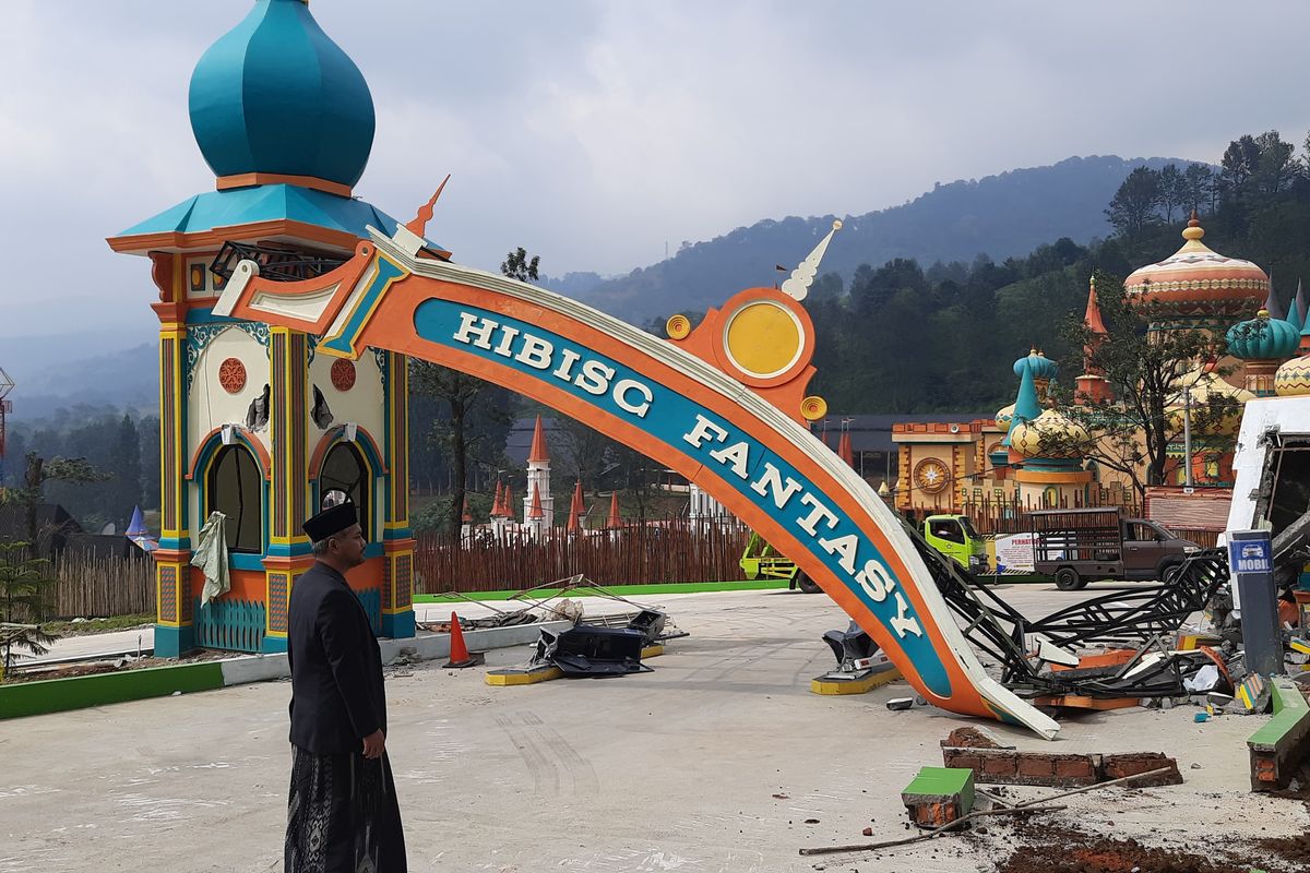 Pemprov Jawa Barat membongkar wahana rekreasi Hibisc Fantasy Puncak di Bogor, Jabar, Kamis (6/3/2025)Massa yang marah akhirnya mengambil tindakan sendiri dengan menyabotase alat berat dan mulai membongkar bagian gerbang serta area tiket masuk wisata.